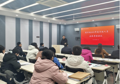 为全面总结年度工作、强化行政人员队伍建设、提升管理服务效能,2026年1月20日下午,商学院在行敏楼106会议室召开2025年度考核会议。学院党政领导班子、全体行政人员、教师代表、学生代表参加会议。会议由党委副书记董胜主持。