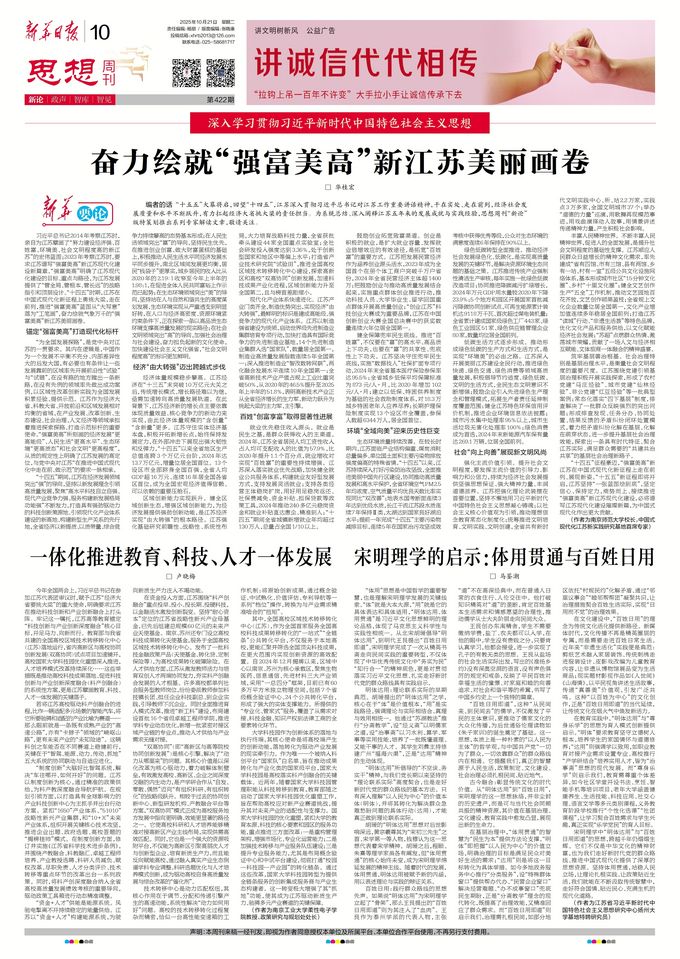 编者的话 “十五五”大幕将启,回望“十四五”,江苏深入贯彻习近平总书记对江苏工作重要讲话精神,干在实处、走在前列,经济社会发展质量和水平不断跃升,有力扛起经济大省挑大梁的责任担当。为系统总结、深入阐释江苏五年来的发展成就与实践经验,思想周刊“新论”版特策划推出系列专家解读文章,敬请关注。